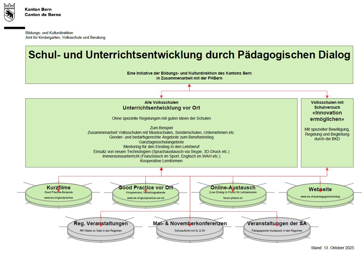 Die Bildungs- und Kulturdirektion hat 2014 zusammen mit der PHBern den Pädagogischen Dialog mit dem Ziel lanciert, den Austausch zu Good Practice mit und unter den Schulen zu fördern. Lehrpersonen und Schulleitende sollen ermutigt werden, Freiräume zu nutzen, ihren Unterricht weiter zu entwickeln und voneinander zu lernen. Denn Wissen und Erfahrung vermehren sich, wenn man sie teilt.